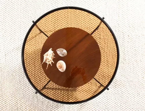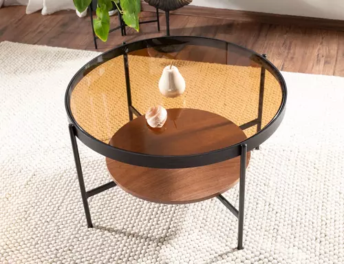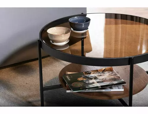 Ława, blat: szkło hartowane bursztynowe + MDF + okleina naturalna, stelaż: metal, kolor: orzech / czarny mat.
