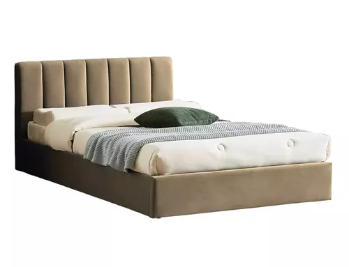 Łóżko z pojemnikiem, tkanina aksamit Bluvel, kolor: 28 beżowy. W komplecie stelaż z listew giętych osadzonych w elastycznych uchwytach, szerokość listwy 5 cm, odstęp miedzy listwami 6 cm. Gazowe siłowniki. Uwaga: pojemnik z miękką podłogą. Wymiar materaca 120x200cm (cena bez materaca).