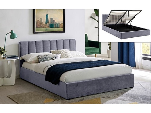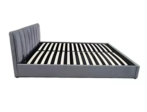 Łóżko z pojemnikiem, tkanina aksamit, kolor: szary, tap. 192. Łóżko zawiera w komplecie stelaż z listew giętych osadzonych w elastycznych uchwytach, szerokość listwy 5 cm, odstęp miedzy listwami 6 cm. Gazowe siłowniki. Uwaga: pojemnik z miękką podłogą. Wymiar materaca 140x200cm (cena bez materaca).
