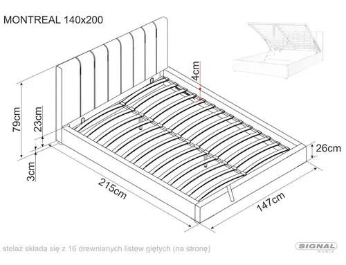 Wymiary łóżka: A - 215, B - 147, C - 140x200, D - 3, E - 4, F - 23, G - 26, H - 79 cm.