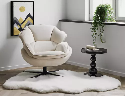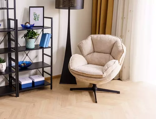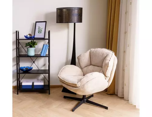 Fotel, tkanina tap. 241, stelaż: metal, kolor: beżowy / czarny. Siedzisko obracane w zakresie 360st. Wymiary fotela: A - 83, B - 73, C - 44, D - 50, E - 87, F - 22 cm...
