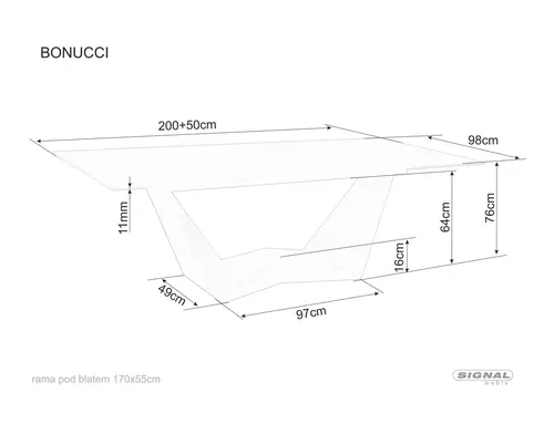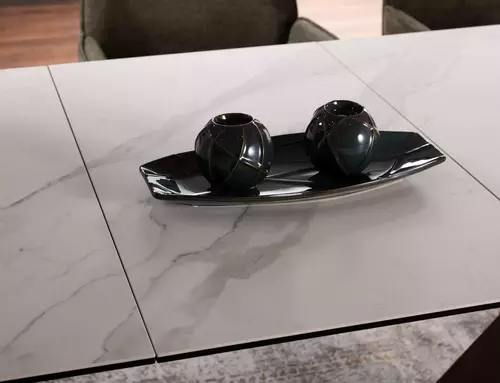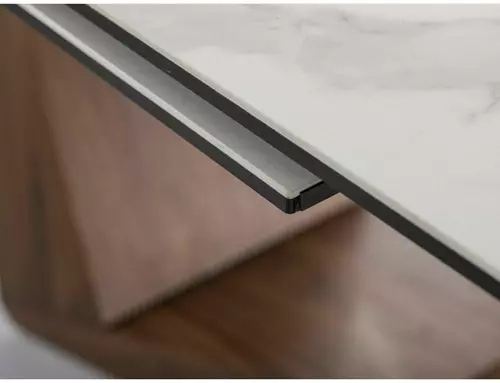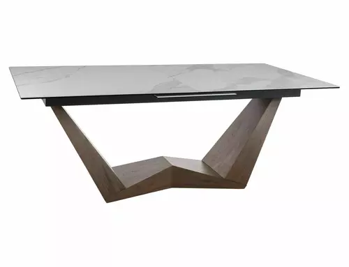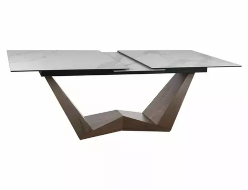 Stół rozkładany, blat: szkło hartowane + ceramika STATUARIO VENATO, stelaż: metal, kolor: biały mat / orzech.